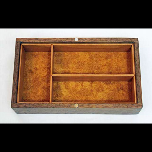 It's produced out of Black Walnut, Figured Maple (often referred to as Quilted Maple) and American Cherry and is lined with a shaggy golden suede . It's been sanded to 400 grit and burnished with fine steel wool for a satin smooth feel. The finish is a mix of 3 coats of wiping varnish followed by 2 coats of wax, producing a finish that is durable and silky. The box features hand cut dovetails and is a truly hand made piece.